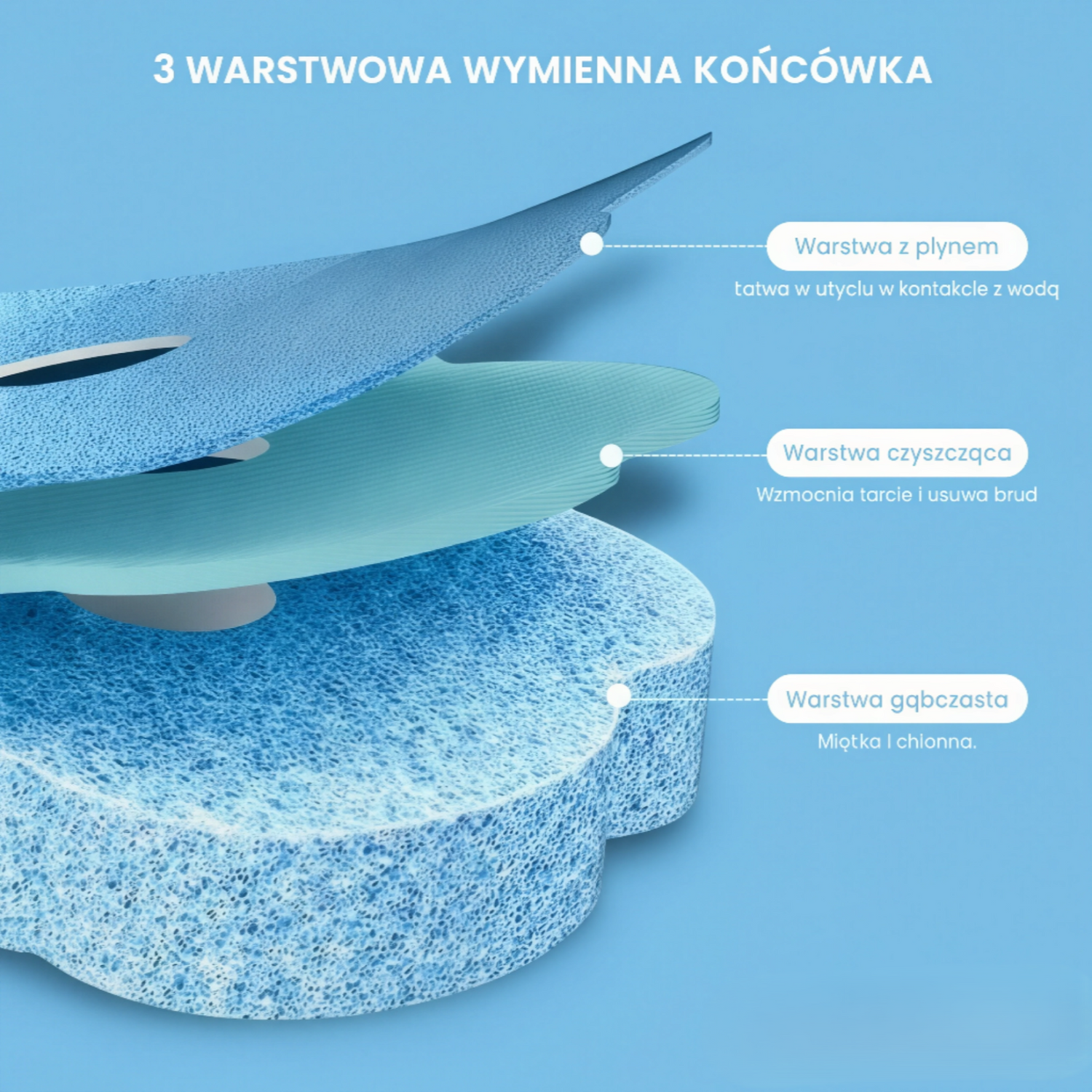 - Końcówki z gąbki i włókniny zawierają aktywny środek, który rozpuszcza kamień i usuwa zabrudzenia.